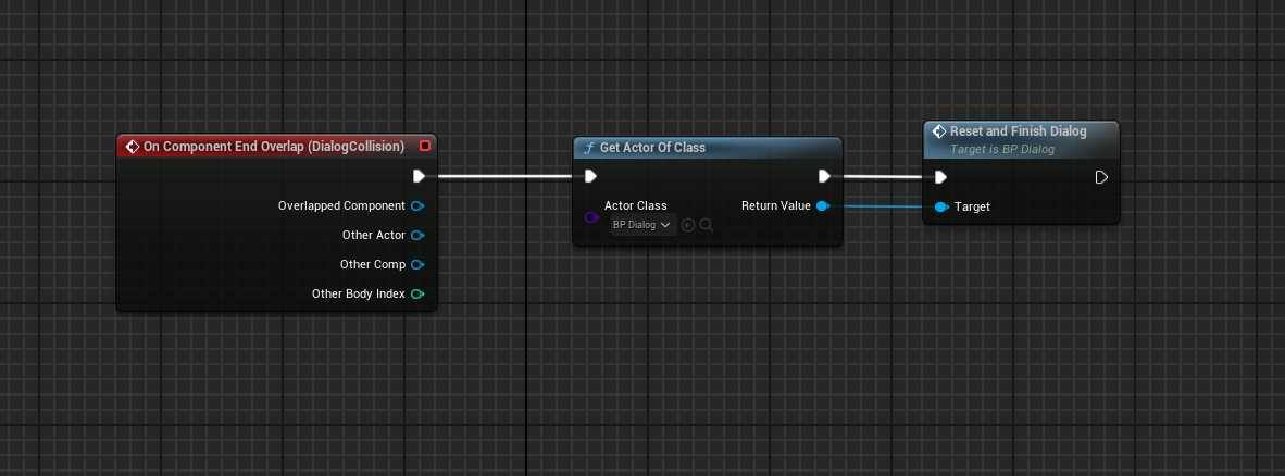 Why is this needed? For example, if a player walks away from a conversation without finishing it, the dialogue will continue wherever the player goes. To control this, you can forcibly end the dialogue when exiting the collision with the interlocutor. This can easily be done by calling the "Reset and Finish Dialog" function in BP\_Dialog.