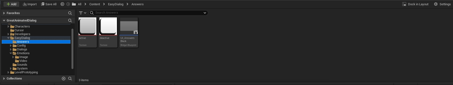The UI_AnswersBlock widget is used to display each button when a player selects an answer. Everything in this folder can be customized and changed.