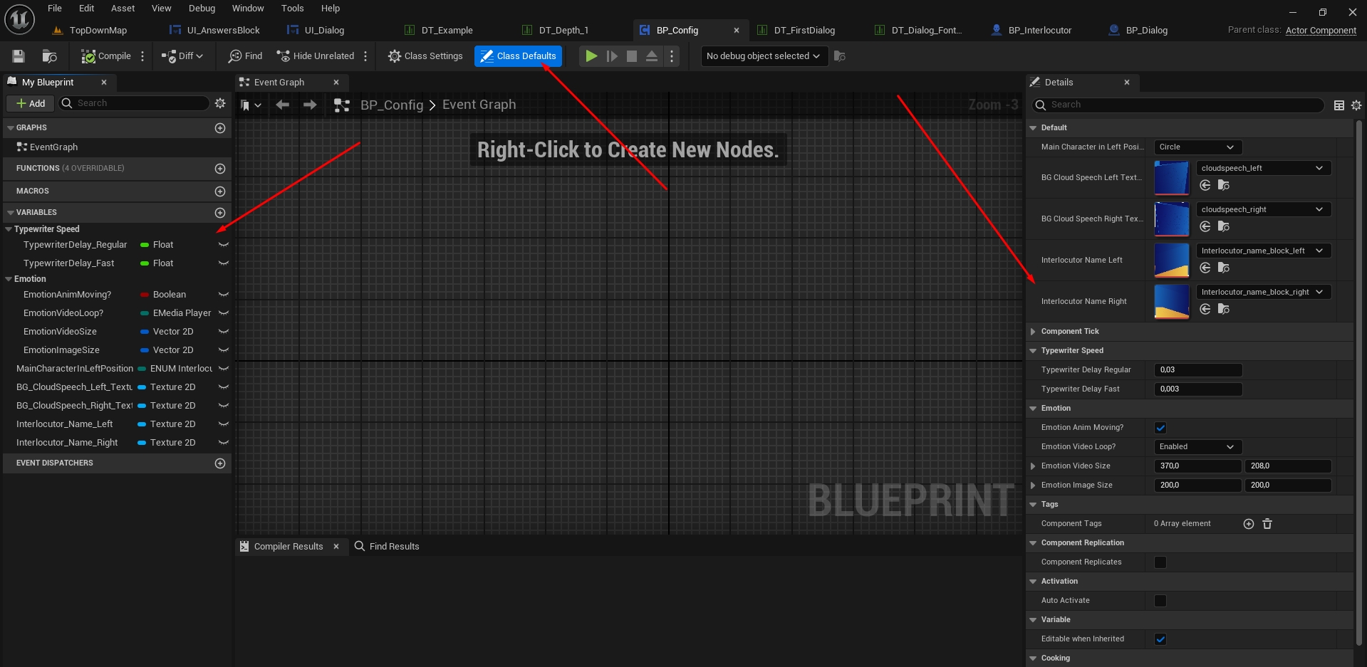 TypewriterDelay\_Fast - sets the typing speed for fast dialogue reading. If the player presses the skip dialogue key. (0.003 - default). The speed can be higher, depending on the task.